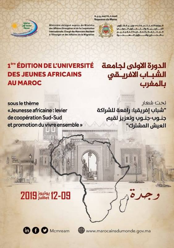 Dans le cadre de la traditionnelle organisation périodique des Universités dédiées aux jeunes Marocains du Monde initiée par le Ministère Délégué Chargé des Marocains Résidant à l’Etranger et des Affaires de la Migration, la capitale de l’Oriental : Oujda ; accueille du 09 au 12 juillet 2019 prochain la première Université des Jeunes Africains au Maroc organisée par le Ministère Délégué chargé des Marocains Résodent à l’Etranger et des Affaires de la Migration en partenariat avec l’Université Mohammed Premier d’Oujda,