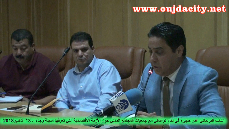 النائب البرلماني الاستقلالي ورئيس جماعة وجدة عمر حجيرة يسعى جاهدا لامتصاص غضب التجار والمهنيين خلال لقاء تواصلي VIDEO
