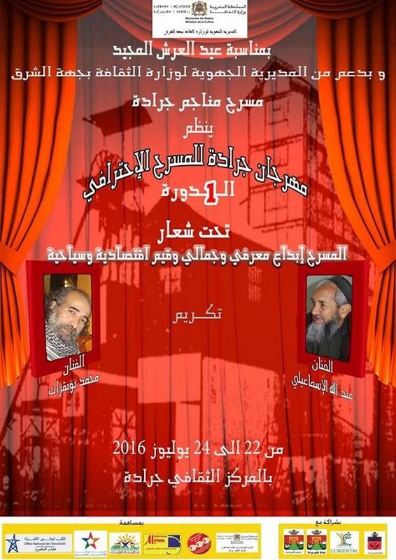 بمناسبة عيد العرش المجيد وبدعم من المديرية الجهوية لوزارة الثقافة بالجهة الشرقية وبشراكة مع المجلس الاقليمي بجرادة –وكالة الجهة الشرقية تنظم الدورة الاولى لمهرجان جرادة للمسرح الاحترافي تحت شعار « المسرح إبداع معرفي وجمالي وقيم اقتصادية وسياحية » وذلك أيام 22-23-24يوليوز 2016بالمركز الثقافي بجرادة .