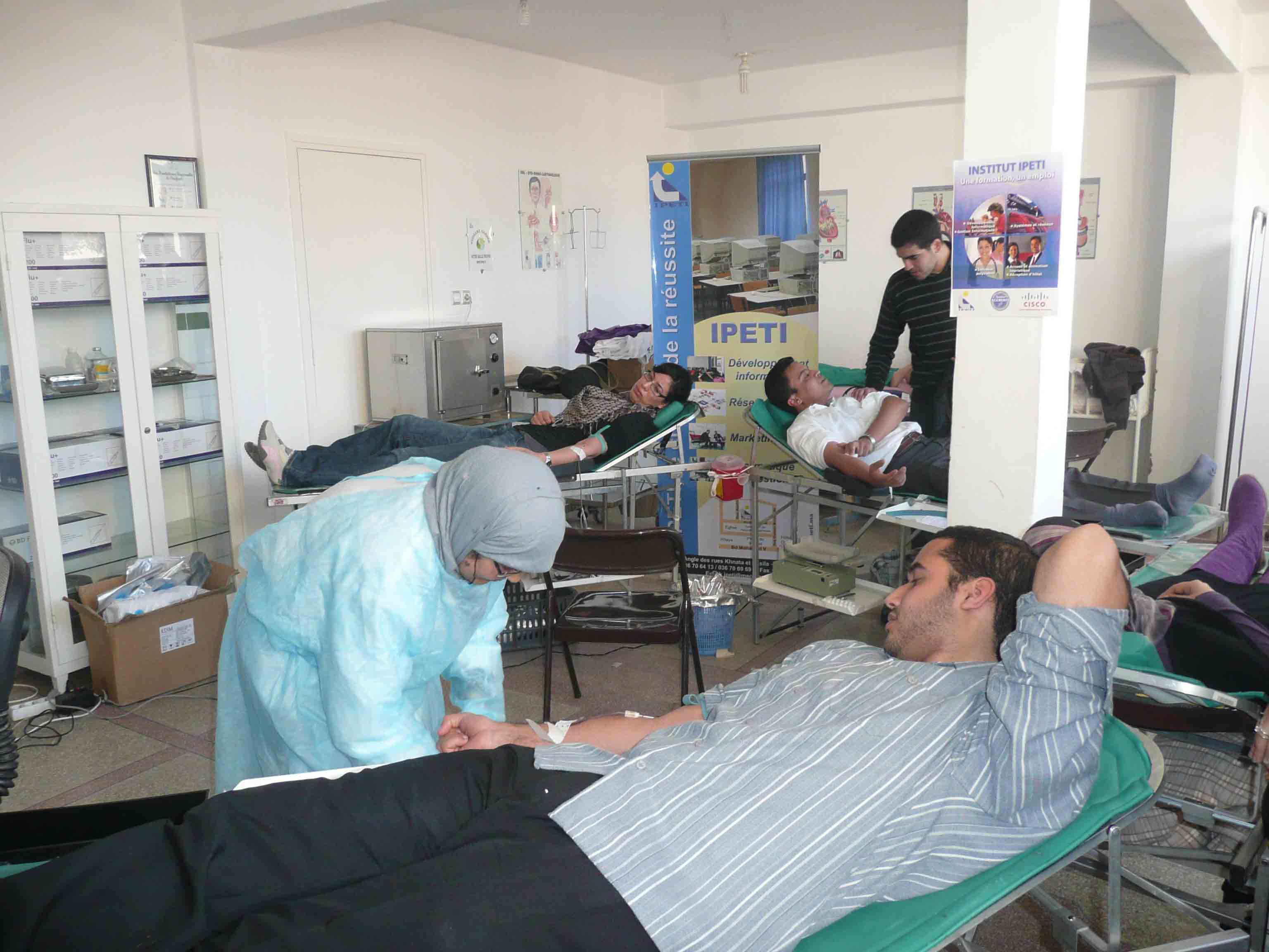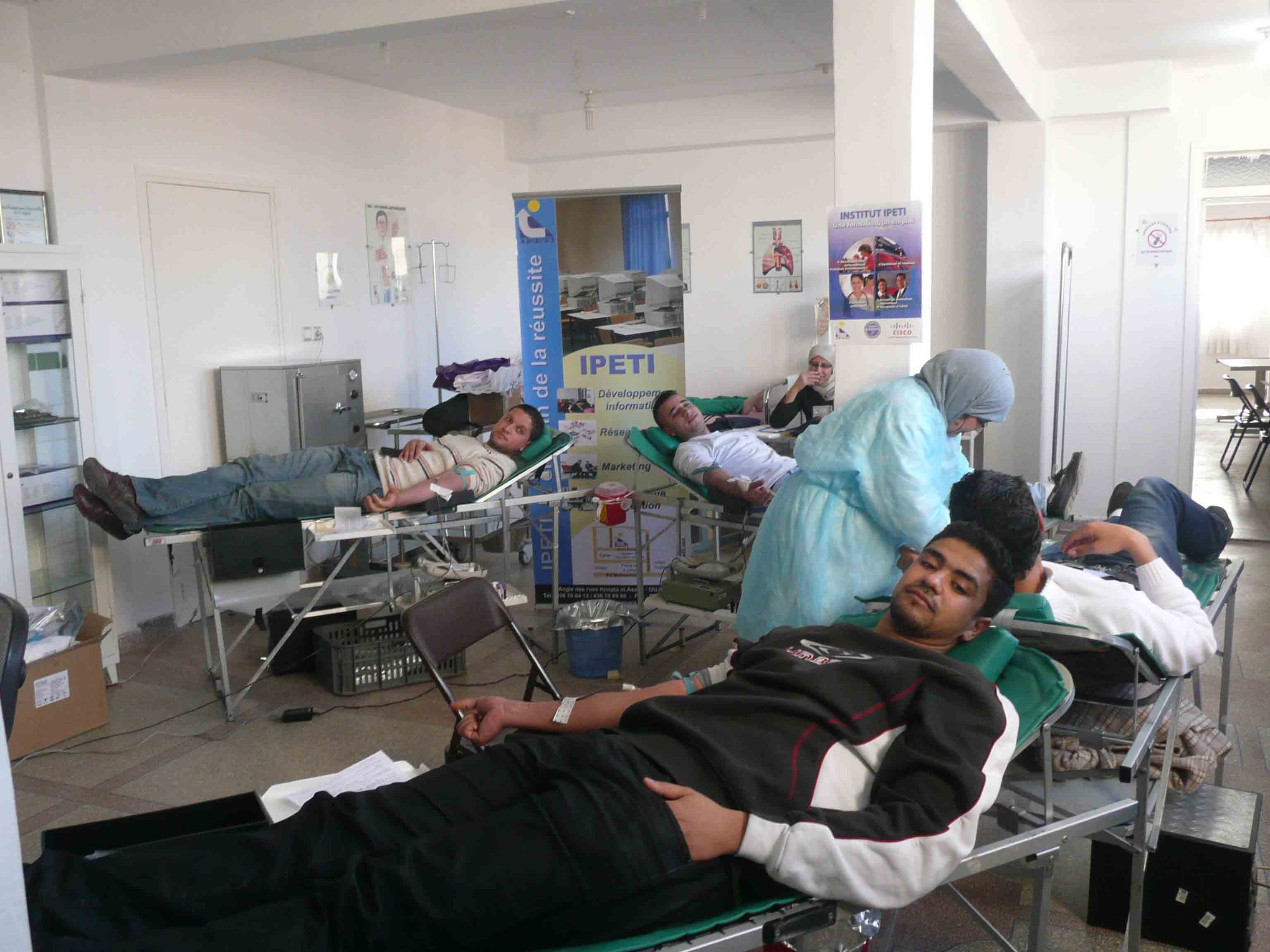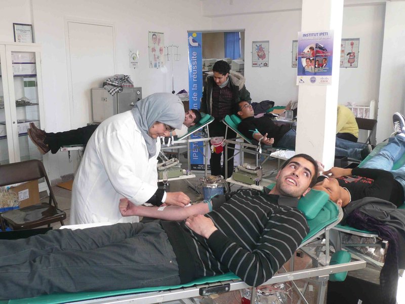 Vous pouvez contribuer à sauver une vie humaine en faisant volontairement don de votre sang de manière régulière ou occasionnelle. Le jeudi 4 mars 2004, 47 volontaires dont 14 filles ont fait don de leur sang à IPETI. Cette action humanitaire vitale a été organisée par IPETI en collaboration avec le centre de transfusion sanguine de l’hôpital El Farabi et l’association des donneurs de sang de la région de l’oriental.