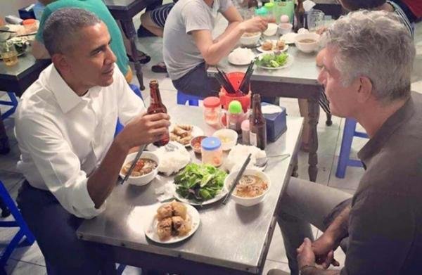 و ذكرت تقارير  أن أوباما و بوردين تناولا العشاء في مطعم (بون تشا هونج) مساء الاثنين شملت الوجبة بعضا من اللحم المشوي و المعكرونة(طبق الحساء التقليدي).