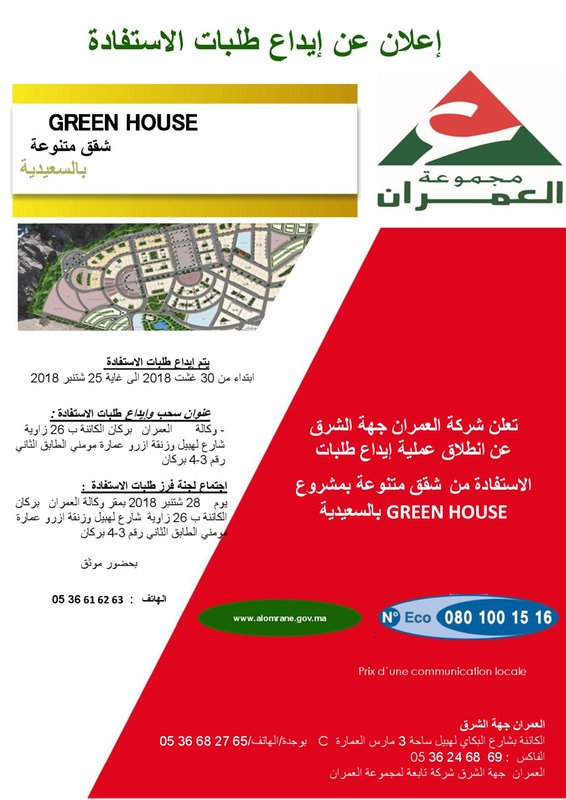تعلن شركة العمران جهة الشرق عن انطلاق عملية ايداع طلبات الاستفادة من شقق متنوعة بمشروع GREEN HOUSE بمدينة السعيدة يتم ايداع طلبات الاستفادة : ابتداء من 30 غشت 2018 الى غاية 25 شتنبر 2018 عنوان سحب وايداع طلبات الاستفادة : ــ وكالة العمران بركان الكائنة ب 26 زاوية شارع لهبيل وزنقة أزرو عمارة مومني الطابق رقم 3 ـــــــ4 بركان اجتماع لجنة فرز طلبات الاستفادة : يوم 28 شتنبر 2018 بمقر وكالة العمران بركان الكائنة ب 26 زاوية شارع لهبيل وزنقة أزرو عمارة مومني الطابق الثاني رقم 3 ــــ 4 بركان بحضور موثق الهاتف : 0536616263