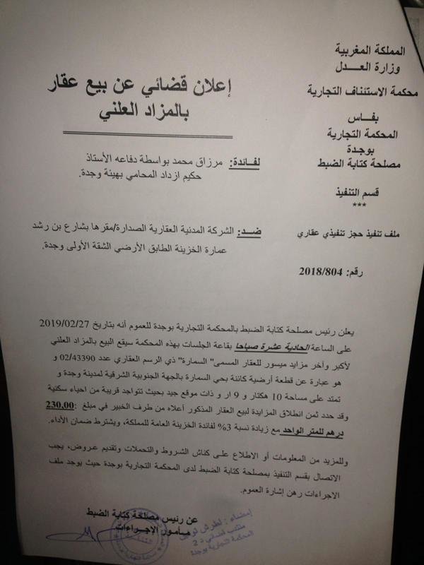 يعلن رئيس مصلحة كتابة الضبط بالمحكمة التجارية بوجدة للعموم انه بتاريخ 2019/02/27 على الساعة الحادية عشرة صباحا بقاعة الجلسات بهذه المحكمة سيقع البيع بالمزاد العلني لأكبر وآخر مزايد ميسور للعقار المسمى » السمارة « ذي الرسم العقاري عدد 02/43390 وهو عبارة عن قطعة ارضية كائنة بحي السمارة بالجهة الجنوبية لمدينة وجدة وتمتد على مساحة 10 هكتارات و9 آر وذات موقع جيد بحيث تتواجد قريبة من أحياء سكنية