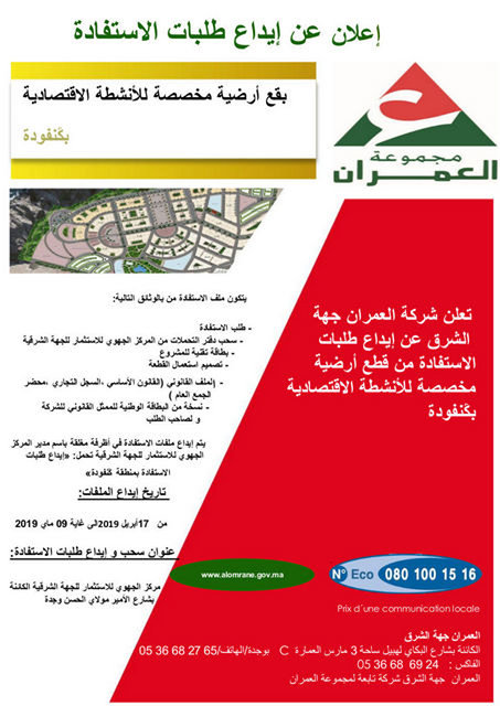 تعلن شركة العمران جهة الشرق عن ايداع طلبات الاستفادة من قطع ارضية مخصصة للأنشطة الاقتصادية بكنفودة