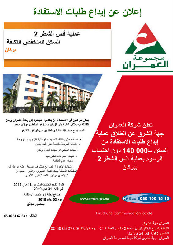 تعلن شركة العمران جهة الشرق عن انطلاق عملية ايداع طلبات الاستفادة من السكن ب 140000 دون احتساب الرسوم بعملية أنس الشطر 2 ببركان
