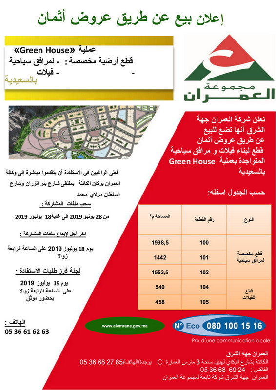تعلن شركة العمران جهة الشرق انها تضع للبيع عن طريق عروض اثمان فطعا ارضية لبناء فيلات ومرافق ساحية متواجدة بعملية Green House