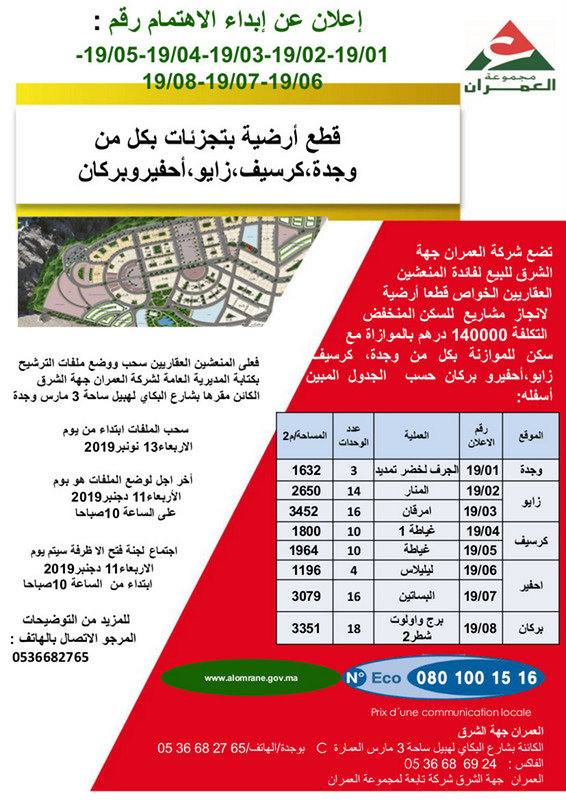 شركة العمران جهة الشرق : قطع ارضية للبيع بتجزئات بكل من وجدة ، جرسيف ، زايو ، أحفير وبركان