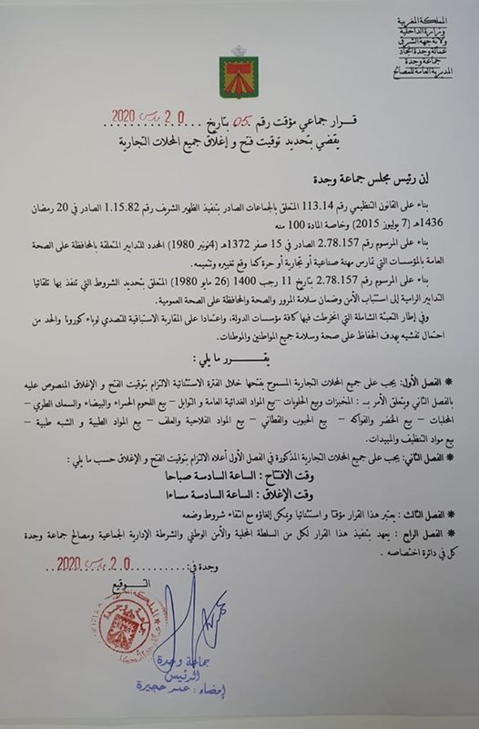 يخبر السيد رئيس جماعة وجدة ساكنة المدينة ان المحلات التجارية المسموح لها بالفتح ايام الحجر الصحي سوف يسمح لها بالاشتغال من الساعة السادسة صباحا الى الساعة السادسة مساء