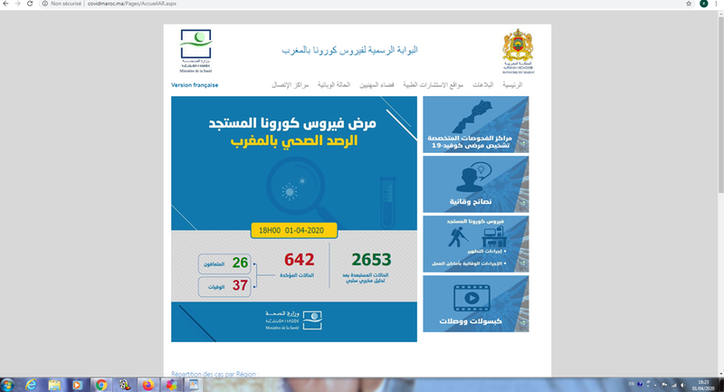 في تصريحها الصحفي اليومي المعتاد ليومه الأربعاء 1 ابريل 2020 اعلنت وزارة الصحة المغربية ان الحالات المسجلة بالاصابات بفيروس كورونا المستجد خلال الأربع والعشرين ساعة الماضية بلغ 40 حالة مؤكدة ….بانخفاض يمثل حوالي 50 في المائة مقارنة مع النسبة المسجلة بداية ألأسبوع والتي كانت 104 حالة مؤكدة ،