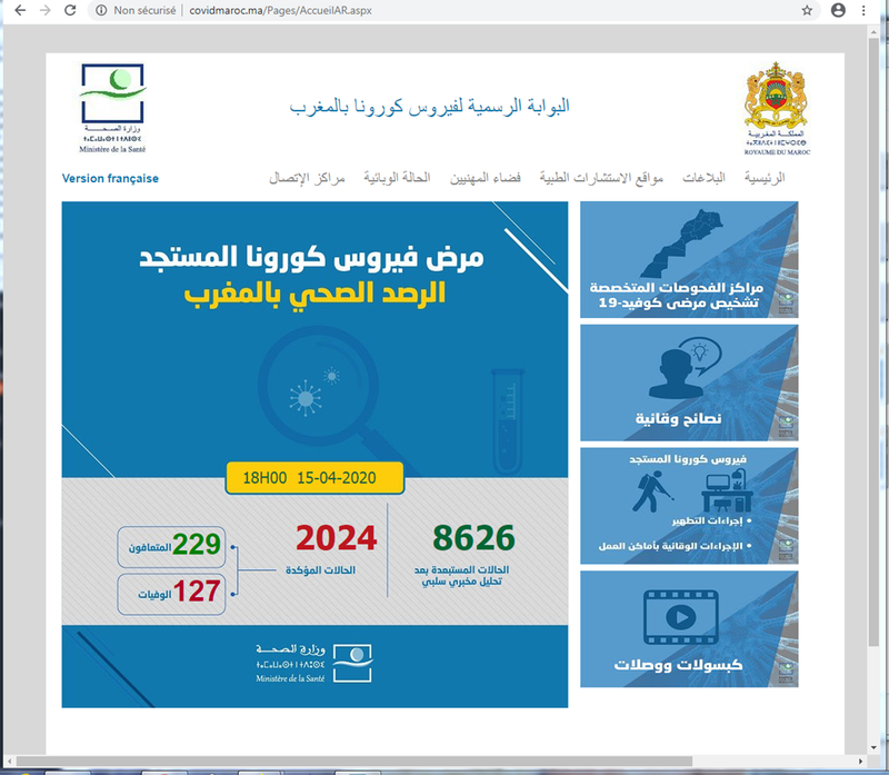 صرحت وزارة الصحة يومه الأربعاء 15 ابريل 2020 ان الحالات الجديدة المسجلة بالاصابة بفيروس كورونا المستجد خلال الأربع وعشرين ساعة الماضية بلغ136 حالة مؤكدة ما مجموعه 2024 حالة منذ بداية انتشار الفيروس …فيما تم استبعاد 8626 حالة … وتم تسجيل حالة وفاة واحدة خلال 24 ساعة الأخيرة ليستقر العدد الاجمالي للوفيات لحد الآن في 127 حالة ، فيما بلغ عدد الحالات المتماثلة للشفاء والمعافاة الكاملة 12 حالة ليصل المجموع الى 229 حالة تماثلت للشفاء منذ بداية انتشار الفيروس بالمغرب ،