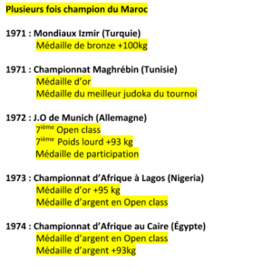Ces insuccès qui ont été nécessaires dans ta progression comme en Turquie aux mondiaux d’Izmir en octobre 1971 où tu as été classé en +100kg (3ième) alors que l’or t’attendait avec également la participation de tes frères d’armes comme en -63kg M. Mustapha Balahmira (6ième), en -70kg M. Abdelatif Elkhayat (6ième) et pour terminer en -80kg M. Hassan Ideddir (5ième).