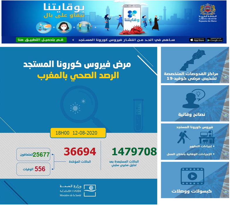 وأوضح منسق المركز الوطني لعمليات طوارئ الصحة العامة بوزارة الصحة، السيد معاد لمرابط، في تصريح صحافي، أن الحصيلة الجديدة رفعت العدد الإجمالي لحالات الإصابة المؤكدة بالمملكة إلى 36 ألفا و694 حالة منذ الإعلان عن أول حالة في 2 مارس الماضي، ومجموع حالات الشفاء التام إلى 25 ألفا و677 حالة، بنسبة تعاف تناهز 70 في المائة، فيما ارتفع عدد الوفيات إلى 556 حالة. ولفت إلى أنه تم تسجيل 1146 حالة إصابة من ضمن الحالات الجديدة (بمعدل 76 بالمائة) في إطار منظومة تدبير المخالطين والبؤر، مضيفا أن معدل الإصابة التراكمي بالمغرب أصبح يناهز 101 إصابة في كل 100 ألف نسمة، حيث أصيب أربعة أشخاص في كل 100 ألف نسمة خلال ال24 ساعة المنصرمة.