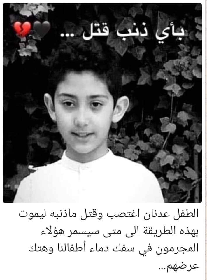 يا عدنان لا تظنّ أن حقك سيضيع هدرا، كن على يقين أن دمك المُراق سيجري في عروق كل أب وأم، كن على يقين أن اليد الآثمة التي امتدت إلى جسدك الطري بالإيذاء، لن تنجو من قصاص عادل.