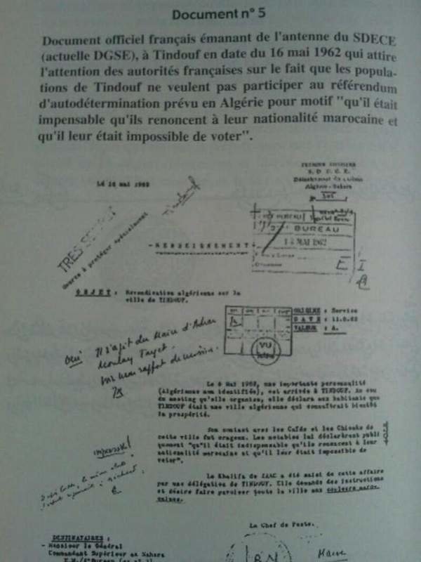 Il suffit de lire un document du Service de Documentation Extérieure et de Contre-Espionnage (SDECE), actuelle Direction Générale de la Sécurité Extérieure, daté du 16 mail 1962 dans lequel il est question du sort d’une partie du Sahara oriental marocain tronqué au profit de l’Algérie.