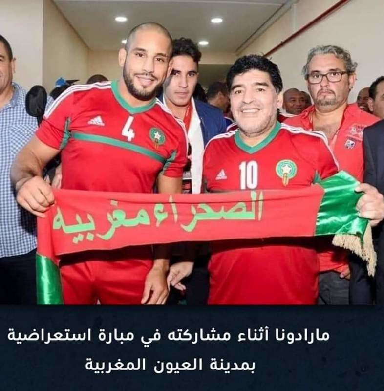 دييغو مارادونا النجم الأرجنتني الكبير الذي سطع نجمه عاليا بلا منازع في الميدان الكرة المستديرة . مارادونا صديق المغرب الكبير انتقل من الأرجنتين الى مدينة العيون بالصحراء المغربية خصيصا لمشاركة المملكة المغربية الشريفة و الشعب المغربي الأصيل في الإحتفال بذكرى المسيرة الخضراء المظفرة التي هندس طريقها المغفور له سيدي مولاي الحسن طيب الله ثراه . ماردونا الشجاع ، حمل القميص والشعار الوطني في مبارة استعراضية صعد نجمه بها في سماء العيون ، حمل العلم الوطني وشارة الصحراء مغربية وعلى صدره شعار الجامعه الملكية المغربية لكرة القدم . و بعد الانتهاء تجول في شوارعها ورقص على أنغام الاغنية الحسانية والكدرة . كان دائما مع الشرعية الدولية سياسيا ، وكان يؤمن إيمانا راسخا بأن الصحراء مغربية وهناك ارتباط قوي ووثيق بين ابناء الصحراء المغربية والعرش العلوي المجيد ، منذ ما يزيد عن ال 12 قرنا . لم تستطع الدولة الحاضنة لهذا النزاع جلبه إليها رغم الاغراءات التي كانت تقدمها للنجوم والدول الإفريقية كمسح الديون مقبل الاعتراف بهذه الجرثمة الخبيثة التي تم زرعها في المنطقة من طرف من لا ضمير له . ماردونا لم يشترى بالمال ، لأنه صاحب ثروة لا قياس لها وصاحب مبادئ . ماردونا لم يرتمي في أحضان من كانوا يردون تقسيمنا بشتى الوسائل الممكنة . رحل الى دار البقاء تاركا من ورائه هذا الموقف التاريخي الشجاع . ينبغي علينا تكريمه لتبقى هذه الذكرى مسجلة للأجيال القادمة التي لم تعاصره وهو يداعب الكرة في الميدان و في ملعب مدينة العيون المغربية . لذى وجب تخليد اسمه وإطلاقة على أحد الشوارع أو الساحات بالصحراء المغربية وبالضبط بالعاصمة العيون .