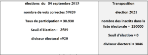 Exemple : comparaison des résultats obtenus aux élections de 2015 dans la commune d’Oujda avec des mêmes nombres de voix seront obtenus éventuellement par les mêmes partis aux prochaines élections de 2021 :