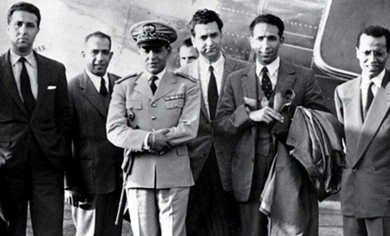 المرحوم الحسن الثاني وخلفه ،يمينا، آيت أحمد بمعية قادة الثورة الجزائرية.