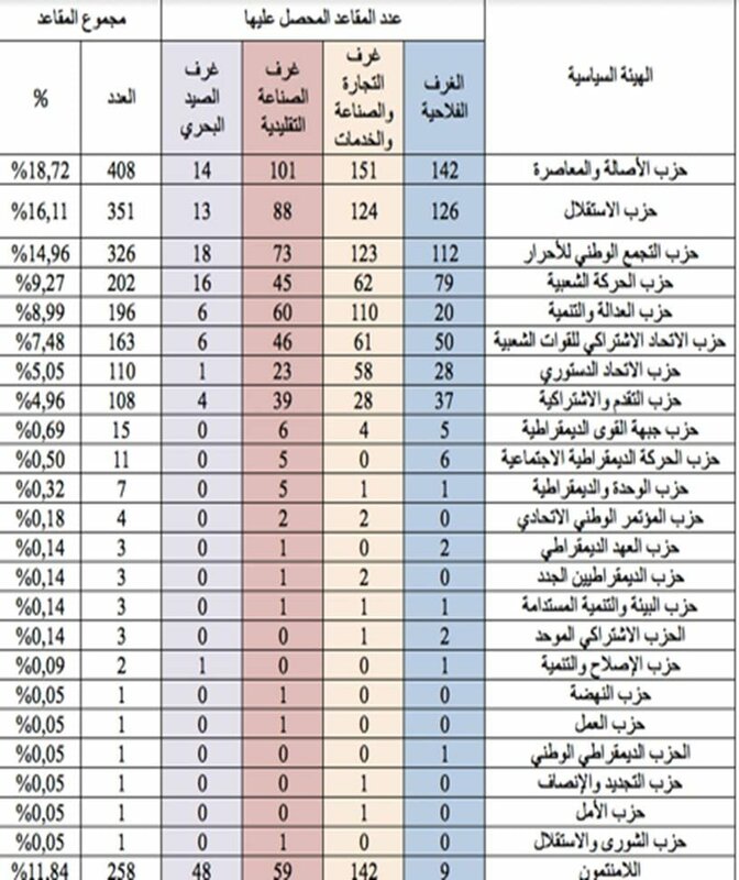 نتائج انتخابات الغرف المهنية على الصعيد الوطني حسب بلاغ وزير الداخلية