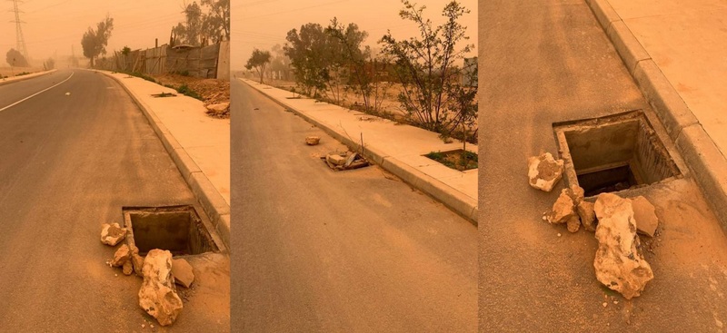 البالوعات المسروقة أو المختفية أو المهترئة التي تكسرت بسبب ثقل المركبات من شاحنات وسيارات وهوندات ودراجات ثلاثة العجلات وعربات مجرورة محملة تخلف حفرا تشكل خطرا على المرتادين من مواطنين راجلين أو سائقين أو عابرين وأطفال صغار.