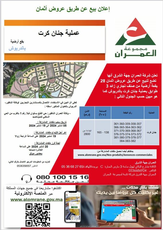 تعلن شركة العمران جهة الشرق أنها تضع للبيع عن طريق عروض أثمان 28 بقعة ارضية من صنف تجاري زائد 3 طوابق بعملية جنان كرت بالدريوش كما هو مبين حسب الجدول التالي :