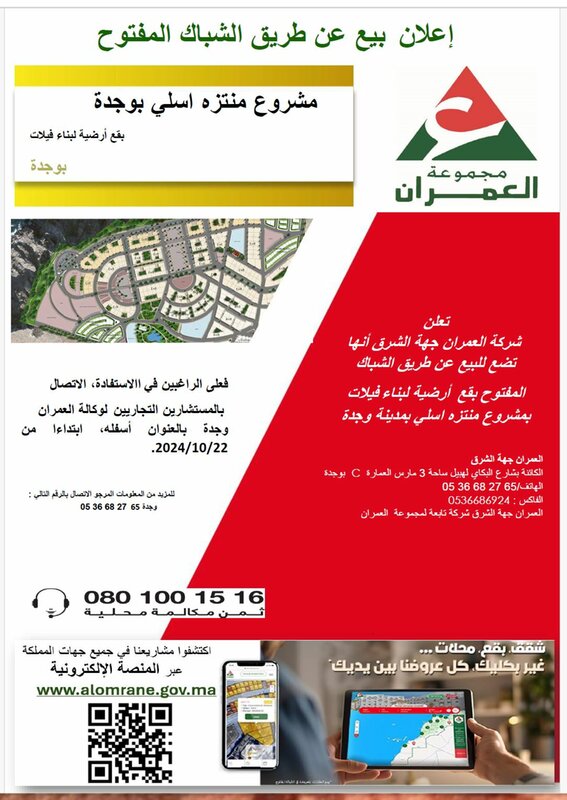 شركة العمران جهة الشرق :اعلان بيع عن طريق الشباك المفتوح ـ بقع ارضية لبناء فيلات بوجدة