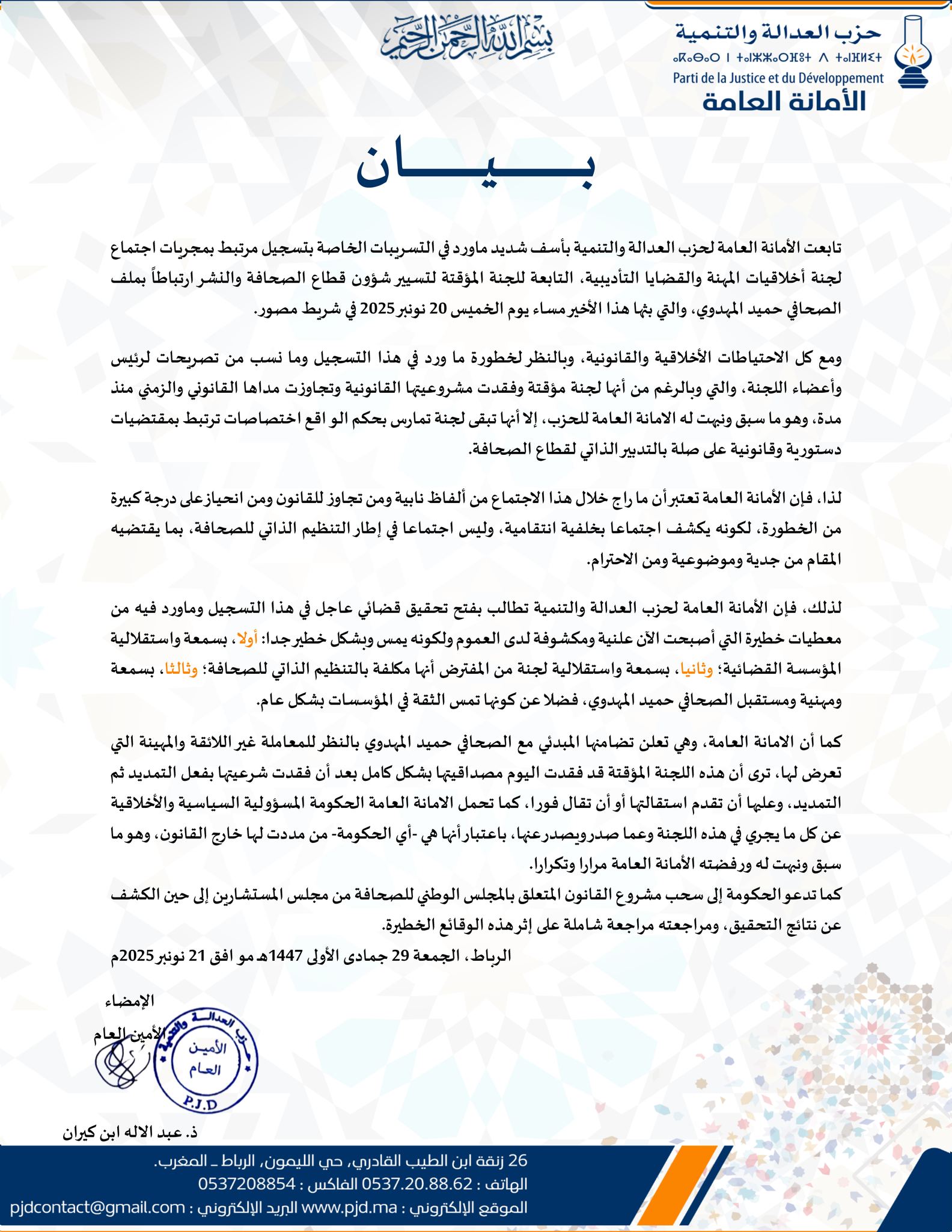 Home»الأمانة العامة لحزب العدالة والتنمية تعتبر أن ما راج خلال اجتماع لجنة أخلاقيات المهنة والقضايا التأديبية، التابعة للجنة المؤقتة لتسيير شؤون قطاع الصحافة والنشر من ألفاظ نابية ومن تجاوز للقانون ومن انحياز على درجة كبيرة من الخطورة، يكشف اجتماعا بخلفية انتقامية»mahdaoui3