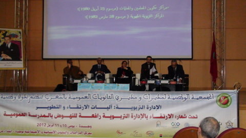تفعيلا لقرار المجلس الوطني للجمعية الوطنية لمديرات ومديري الثانويات العمومية بالمغرب ، وهو مجلس عقد بمدينة مراكش يومي 3 و4 مارس 2012 والقاضي بعقد ندوة وطنية حول الإدارة التربوية بمدينة وجدة يومي 10 و11 أبريل 2012 ، افتتحت يومه هذه الندوة  بمركز الدراسات والبحوث الإنسانية والاجتماعية بوجدة تحت شعار :  » الارتقاء بالإدارة التربوية رافعة للنهوض بالمدرسة العمومية  » ، وذلك بحضور ممثلين عن هذه الجمعية وطنيا وجهويا  ،إلى جانب حضور ممثل عن وزارة التربية الوطنية ، ومدير أكاديمية الجهة الشرقية ، وبعض نواب نيابات الجهة ، والسيد رئيس المجلس العلمي المحلي بوجدة ، وممثلو السلطات ، وبعض أطر المراقبة التربوية ، وهيئات نقابية  فضلا عن أطر الإدارة التربوية . وقد افتتح الندوة بآيات من الذكر الحكيم تيمنا ، تلتها كلمات ترحيبية للمكتب الجهوي للجمعية ، والمكتب الوطني ، فكلمة وزارة التربية الوطنية ، ثم كلمة الأكاديمية الجهوية . وكلها كلمات أكدت على أهمية  هذه الندوة الوطنية في هذا الظرف بالذات . وبعد كلمات الترحاب قدمت مداخلات  لكل من السادة : الأستاذ سعيد حموتي ، تناولت واقع الإدارة التربوية بين التكليف بالمهام وتعدد المسؤوليات وآفاق الإصلاح ، والدكتور يحيى الحلوي وكانت عبارة عن قراءة في المرسوم الوزاري رقم 2.11672 في شأن إحداث وتنظيم المراكز الجهوية لمهن التربية والتكوين ، والأستاذ حسن حلوي وتركزت حول مقاربة جديدة لتدبير المؤسسة التعليمية .
