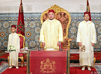 En cette occasion nationale mémorable, où nous passons en revue et évaluons les réalisations accomplies dans le cadre des réformes engagées, autant que les initiatives vouées au développement, où nous scrutons les perspectives d’avenir prometteuses, et où nous amorçons la mise en œuvre de la Constitution, nous sommes animés par une pensée révérencieuse de totale fidélité à la mémoire immaculée des deux leaders de la libération du Maroc et bâtisseurs de son Etat moderne, Notre Auguste Grand-Père, feu Sa Majesté le Roi Mohammed V, et Notre Vénéré Père, feu Sa Majesté le Roi Hassan II, que Dieu les ait en Sa Sainte Miséricorde, ainsi qu’à celle de tous les valeureux martyrs tombés pour la liberté, l’indépendance et l’intégrité territoriale du pays, et par fidélité au serment fait devant Dieu. Fasse-t-Il qu’ils soient rétribués de la plus belle récompense pour leurs sacrifices au nom de leur patrie et de leur Oumma.