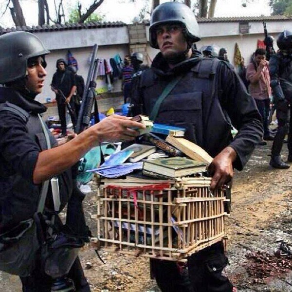 قبل فض اعتصام رابعة العدوية بايام تحدثت وسائل اعلام العهارة المصرية التي تطبل وتغيط لسفاح مصر الجديد الجنرال عبد الفتاح السيسي قائلة بوجود اسلحة خطيرة يمتلكها المعتصمون بميدان رابعة العدوية وميدان النهضة ، وبالفعل لما هاجم عسكر السيسي الميدانين وهم مدججين بالمدرعات والمصفحات والرشاشات ، حيث حولوا ساحة رابعة الى حمام دم لم يسبق ان ارتكب في تاريخ مصر الحديث ، اكتشف انذال السيسي الاسلحة الفتاكة التي كانت بميدان رابعة والتي كان يمتلكها المحتجون السلميون وهي عبارة عن مصاحف قرآنية ـ انظر الصورة ـ