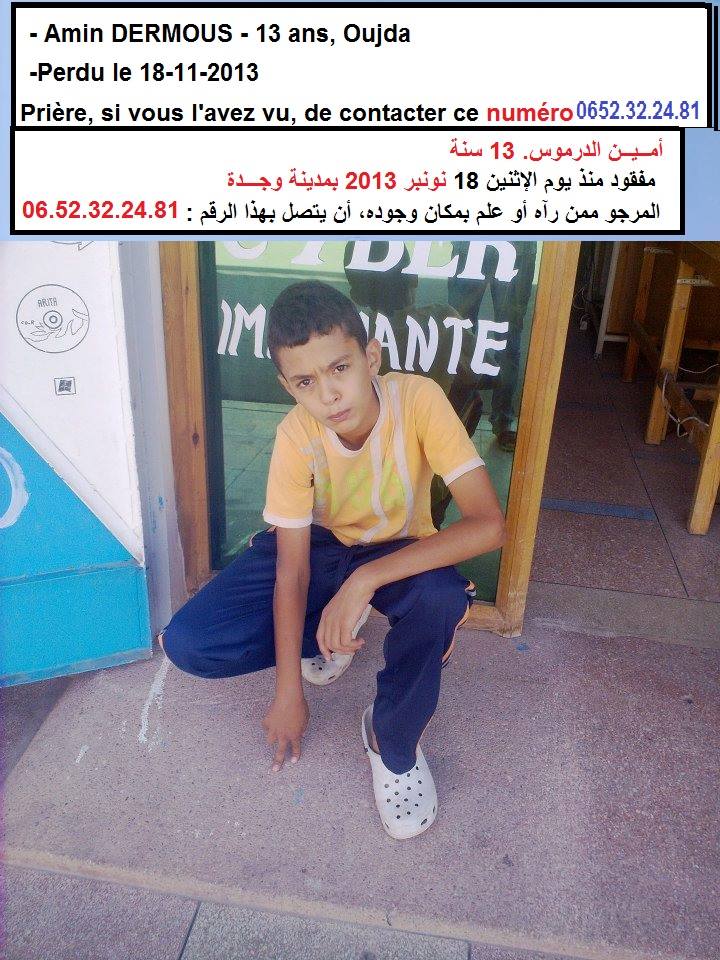 من فضلكم حتى الشاب محمد لحفاوي اختفى يوم 10 نونبر 2013 عن منزلهم ؛ يبلغ من العمر 18 سنة ويسكن في حي الزيتون من التقى به رقم هاتف والده هو 0699433206 واله لا يضيع أجر المحسنين