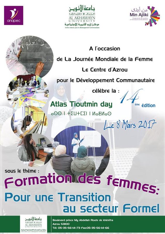 Dans le cadre de la mobilisation des capacités des femmes porteuses de projets au Moyen Atlas (urbain et rural) et la mise en valeur de leur initiative pour l’esprit d’entrepreneuriat pour accéder à une structure formelle et reconnue en matière de développement, le Centre d’Azrou pour le Développement Communautaire relevant de l’Université Al Akhawayn en collaboration avec l’Association pour la Promotion de l’Education et de la Formation à l’Etranger (APEFE) et l’Agence Nationale pour la Promotion de l’Emploi et des Compétences (ANAPEC) organise une journée d’étude et de formation le 08 mars 2017 autour de la thématique: « Formation des femmes : Pour une Transition au Secteur Formel »
