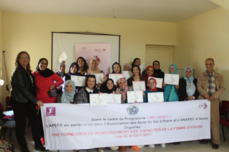 Dans le cadre de ses activités à caractère socio-culturel et de développement par la formation ; l’Association des Amis du Val d’Ifrane pour la protection de l’environnement et la promotion de l’écotourisme avec le concours précieux de l’Association pour la Promotion de l’Education et de la Formation à l’Etranger (APEFE) à travers son programme « MIN AJLIKI » développé et au Maroc et de l’Agence d’Azrou de l’ANAPEC a organisé et bien réussi une première formation en matière de développement des capacités féminines à Ifrane le jeudi et vendredi 02 et 03 novembre 2017 dernier.