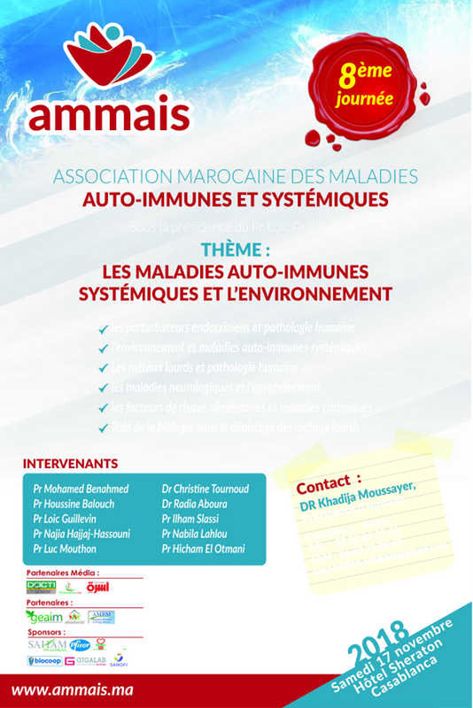 L’association marocaine des maladies auto-immunes et systémiques «AMMAIS» organise la 8ème journée de l’auto-immunité, le samedi 17novembre 2018 à l’hôtel Sheraton de Casablanca, sur le thème « environnement et maladies auto-immunes et/ou systémiques ».