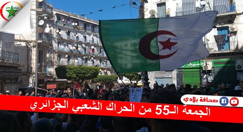 يواصل الحراك الشعبي مسيراته بعزيمة واصرار ، في شوارع العاصمة والمدن الأخرى ليبلغ هذا اليوم جمعته الـ 55 ، للمطالبة برحيل رموز النظام البوتفليقي ، وبإسقاط الفساد والاستبداد، وإطلاق سراح معتقلي الرأي والنشطاء الحقوقيين وحرية التعبير… هدا وكعادته انطلق المتظاهرون من شارع ديدوش مراد والتحرك ، في اتجاه الساحات الكبرى للعاصمة في البريد المركزي وساحة الأمير عبد القادر، مباشرة بعد انتهاء صلاة الجمعة، حاملين شعارات تطالب بالإفراج عن سجناء الحراك و معتقلي الرأي، بينما حمل بعضهم صور للنشاط كريم طابو أحد أبرز وجوه الحراك منذ بدايته قبل عام و المتواجد رهن الحبس في انتظار إصدار الحكم النهائي في حقه.