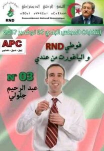 صورة الوزير الأول السابق « أويحيى » المسجون المحكوم بأكثر من 15 سنة والرئيس السابق لحزب التجمع الوطني الديمقراطي، تعلو ملصق صورة المترشح وزبانيته وهو بصدد لإشعال شمعة، وملصق لمترشح آخر من نفس الحزب بنفس الحجم والشكل وصورة « اويحيى » لكن بشعار « فوطي الإرندي RND والياوورت من عندي ».