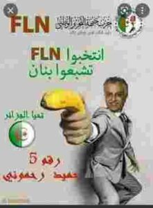 مترشح جبهة التحرير الوطني اهتدى إلى ملصق فيه صورته يجسد فيها حركة شخص يستعد لإطلاق رصاصة من مسدس لكن يحمل موزة رافعا شعارا الحزب « انتخبوا FLN تشبعوا بنان ».