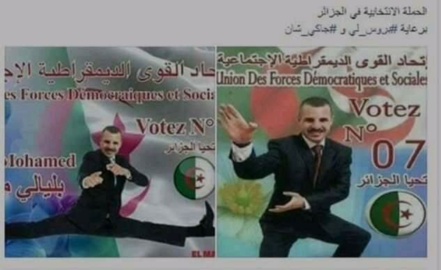 وسجلت الحملة الانتخابية الخاصة بانتخاب أعضاء المجالس الشعبي البلدية والولائية المزمع تنظيمها يوم 27 نوبر الجاري، ملصقا تظهر فيه صورة صاحبه في حركة بهلوانية من رياضة فنون الحرب القتالية لتجسيد اسم حزبه « اتحاد القوى الديمقراطية الاجتماعية ».
