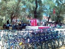زغاريد الأمهات كانت تهز أرجاء الدوار وتهتز معها مشاعر الحضور في كل اللحظات التي كان يتسلم فيها الأطفال دراجاتهم خلال فقرات الحفل الذي شاركوا فيه بأناشيد ولوحات فنية. وقد شارك في التوزيع نواب الوزارة بتارودانت وانزكان و اكادير والسيد ممثل السلطة قائد المنطقة وممثلين لجمعيات المجتمع المدني. والشاعر المغني الأمازيغي لحسن أجماع أضفى نكهة خاصة على الحفل لما انشد قصيدة بالمناسبة نالت تصفيق الحاضرين وزغاريد الحاضرات.وفي الختام ألقت الأستاذة : سعاد حدة كلمة نيابة عن أطر المدرسة جاء فيها :إن حضوركم تعبير عن نجاحنا في مهمتنا وهو كاف لدعمنا وتشجيعنا ووجودكم بيننا أزاح عنا الشعور بالعزلة القروية وحفلنا هذا هو ثمرة عمل الأطر الجاد وعدم انسياقهم مع دعاة اليأس ونتيجة تفاعل بين المدرسة ومحيطها الذي انفتحت عليه وهو ما شجع التلاميذ على التمدرس وحد من الهدر المدرسي حيث واصل كل تلاميذ المدرسة تعليمهم خلال السنة الدراسية الحالية ولم ينقطع أي واحد وهو نجاح ثان يحتفل به اطر المدرسة.بعد ذلك تناول الكلمة الأستاذ لحسن باكريم عضو مؤسس للجمعية شكر فيها كل من ساهم في نشر الفرحة في الدوار وأزاح بحضوره شعور العزلة عنهم وأحسوا بأنهم موضوع تفكير من طرف الآخر المتواجد هناك بالمدينة متمنيا أن تتواصل مثل هذه النشاطات للمساهمة في تنمية الإنسان والمنطقة.