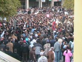 هب سكان مدينة وجدة في مسيرة حاشدة يومه الأحد 05/02/2006 بعد صلاة العصر تلبية للنداء الذي وجهته جماعة العدل والأحسان بوجدة قصد التنديد بالرسومات الكاريكاتيرية التي تسيء الى رسول الله صلى الله عليه وسلم والتي نشرتها أحدى الصحف الدانماركية و النرويجية ، فبعد قيام صلاة العصر بمسجد عمر بن عبد العزيز والذي لم يتسع لآلاف المواطنين الذين لبوا النداء نساءا ورجالا، ومباشرة بعد صلاة العصر انطلقت مسيرة حاشدة الى شارع محمد الخامس ، لتلتحق بها بعد ذلك مسيرات متفرقة جاءت من مساجد وسط المدينة ليحتشد الكل امام مقر المجموعة الحضرية مرددين شعارات منددة بالأساءة الى رسول الله صلى الله عليه وسلم ، ومنددين بكل الدول التي تعيد نشر هذه الرسومات ، حيث كانت الجماهير الحاشدة تردد بغضب " بالروح بالدم نفديك يارسول الله " ، " والله أكبر " "ولا اله الا اله محمد رسول الله " … كما كان المتظاهرون يحملون عدة لا فتات منددة بالأساءة الى رسول الله صلى الله عليه وسلم ، ومن بينها" جماعة العدل والأحسان بوجدة تستنكر بشدة الأساءة لرسول الله صلى الله عليه وسلم " و" جماعة العدل والأحسان : فداك ارواحنا يارسول الله " كما حملت لافتة أخرى كتب عليها " قال الأمام مالك : مابقاء امة سب نبيها " و " احموا رسول الله احموا كتاب الله " ولاقتات كتبت عليها آيات قرآنية … ثم قام المتظاهرون باحراق العلم الدنماركي تعبيرا على سخطهم وغضبهم…عن رفض دولة الدانمارك عن الأعتذار للمسلمين .
