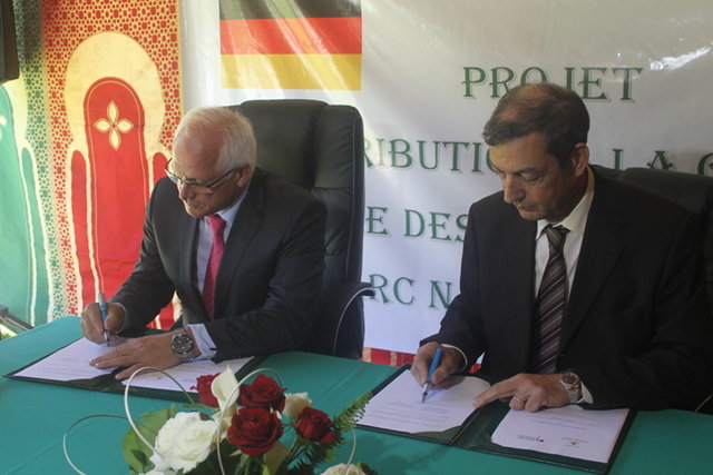 Le Haut-Commissaire aux Eaux et Forêts et à la Lutte Contre la Désertification, Dr. Abdeladim Lhafi et le Ministre délégué au Ministère Fédéral Allemand de l’Alimentation et de l’Agriculture Peter BLESER ont procédé Mercredi 29 Avril 2015 à la station de pisciculture de Ras El Mae dans la Province d’Ifrane à la signature d’une déclaration d’intention visant la réalisation du projet « Contribution à la gestion durable des forêts de cèdre du Parc National d’Ifrane », et ce en exécution de l’accord du 24 novembre 1966 sur la coopération économique et technique conclu entre le gouvernement de la République fédérale d’Allemagne et le gouvernement du Maroc tel que modifié par l’échange de lettres des 7 avril / 18 mai 1983.en plein forêt d’Azrou, Province d’Ifrane.