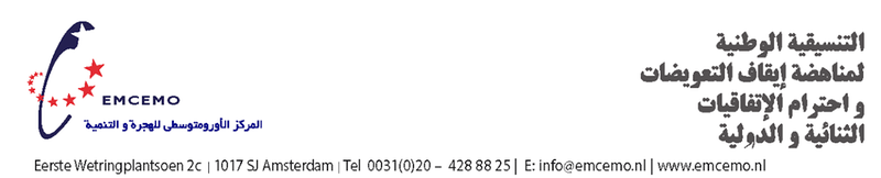 إن تنسيقية مناهضة تخفيض التعويضات و احترام الإتفاقيات الثنائية و الدولية، تندد بشدة بقرار الحكومة الهولندية بإلغاء اتفاقية الضمان الإجتماعي و ما قد ينجم عن ذلك من تداعيات خطيرة على معاشات الأطفال و الأرامل و المتقاعدين، كما نندد أيضا بالسلوك اللامسؤول للمسؤولين المغاربة و تلاعبهم بمصالح الجالية المغربية. إن تنسيقية مناهضة تخفيض التعويضات ستلجأ إلى اتخاذ كل الخطوات النضالية و القانونية للوقوف إلى جانب الجالية المغربية و دعمها في هذه المحنة التي تمر منها و حماية حقوقها و مصالحها الحيوية
