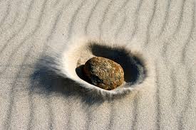 Selon A. Simmonet de la NASA, l’espace est comme un tissu élastique et la pierre jetée sur ce tissu y crée une dépression. Les autres billes pénètrent légèrement dans la dépression et se mettent en mouvement avec des trajectoires qui se courbent. Notons quand même les limites de cette analogie qui fait appel à une dimension externe au tissu et à la gravité pourdéformer celui-ci. En réalité, ni dimension supplémentaire, ni force externe ne sont nécessaires
