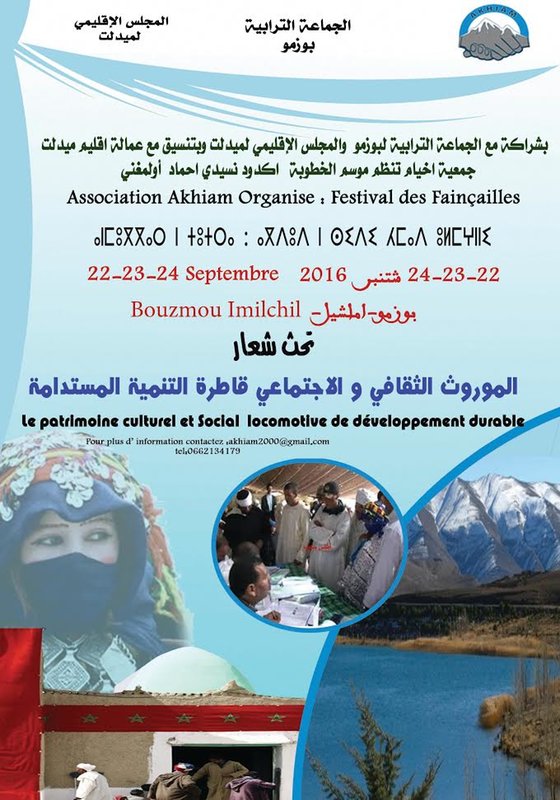 L’Association Akhiam pour le développement économique et social en partenariat avec la Commune Rurale de Bouzamou et le conseil provincial de Midelt organise avec le concours de la Province de Midelt Le moussem des fiançailles d’Imilchil ou AGDOUD (Moussem) Sidi HMAD OULMGHNI, comme l’appelle les villageois et ce, du 22 au 24 septembre 2016 prochain sous le thème : « Le patrimoine culturel et social, une locomotive de développement durable »