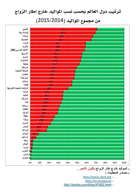 في حالة الدول العربية و الإسلامية نجد أن ظاهرة الأطفال خارج إطار الزواج ما تزال محدودة لا ترقى إلى مستوى الخطورة الذي وصلت إلى دول أوربية و أمريكية ؛ هذا ما تكشف عنه بعض الأرقام التي تجتهد منظمات من المجتمع المدني في تقديرها في ظل غياب أرقام رسمية يعتد بها ، ففي حالة دول المغرب الثلاث : تونس و الجزائر و المغرب نجد على التوالي نسب 0.2 % و 0.1 % و 0.8 % سنة 2015 . هي نسبة ضعيفة على العموم ، غير أنها بمثابة دق ناقوس الخطر الذي يتطلب منا مزيدا من اليقظة و الحذر ، و تعبئة الجهود لتعزيز مكانة الأسرة و إمدادها بكل وسائل البقاء و القوة التي تعزز تماسكها و تضمن استمراريتها ، و الحرص على التصدي لكل الدعاوى الفكرية المنحرفة الضالة التي تهدد صروح أسرنا و بالتالي مجتمعاتنا و أوطاننا .