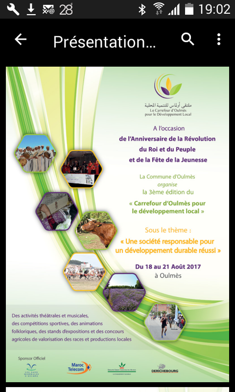 Comme annoncé en son temps ; la collectivité territoriale d’Oulmès et l’association Moltaka Ait Amer pour le développement local ont organisé la 3ème édition du Carrefour d’Oulmès pour le Développement Local du 18 au 21 Août 2017 dernier sous le thème de : « Une société responsable pour un développement durable réussi ».