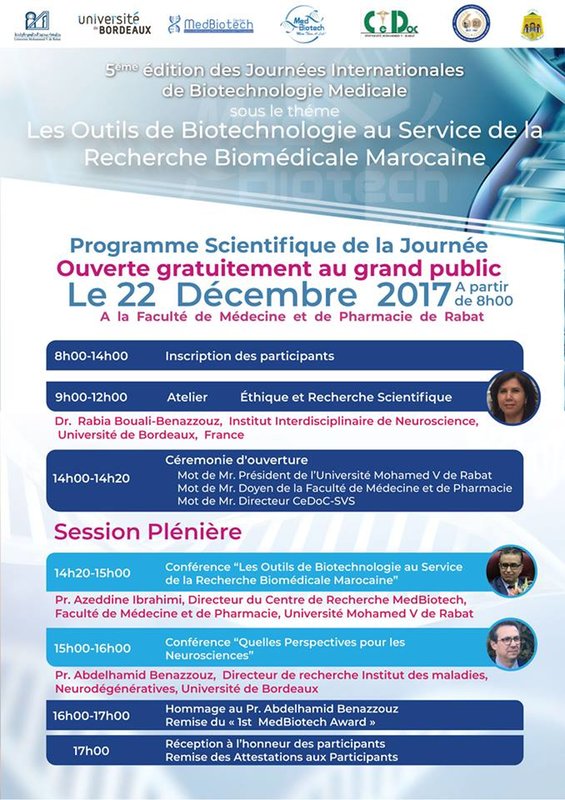 Dans le cadre d’un partenariat entre l’Université Mohammed V de Rabat – Centre Doctoral des Sciences de la Vie et de la Santé et Faculté de Médecine et de Pharmacie-Rabat et l’Université de Bordeaux; le Laboratoire MedBiotech organise la 5ème édition des Journées Scientifiques Internationales sous le thème: « Les outils de biotechnologie au service de la recherche biomédicale au Maroc », du 18 au 23 Décembre 2017 à la Faculté de Médecine et de Pharmacie de Rabat.
