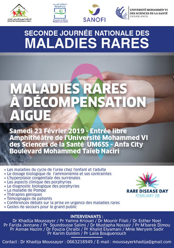 Cette pathologie fait l’objet d’un examen lors de la seconde journée des maladies rares, le 23 février 2019, que l’Alliance des Maladies Rares au Maroc (AMRM), une association de malades organise sous le patronage du Ministère de la Santé à l’université Mohamed VI des Sciences de la Santé de Casablanca. Cette journée d’information est l’occasion de donner aussi un éclairage sur les crises aigues et brutales que provoquent certaines de ces pathologies rares et entraînant bien trop souvent handicaps et décès, à cause d’une indisponibilité de médicaments, de moyens adéquats, de diagnostic … au Maroc et cela au travers notamment d’autres exemples de groupes de maladies :