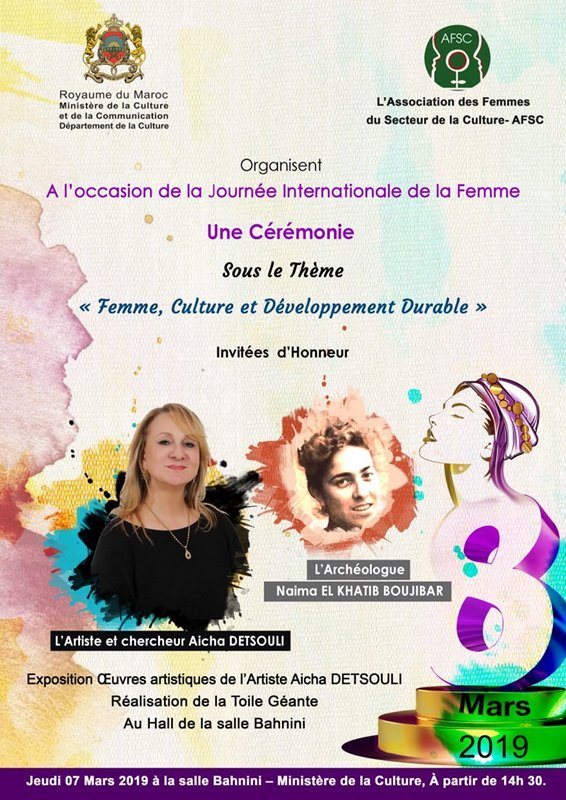 En célébration de la journée mondiale de la femme placée cette année sous le thème de« Penser équitablement, bâtir intelligemment, innover pour le changement »; L’association des femmes du secteur de la culture soutenu par le ministère de la culture et de la communication organise ; Jeudi 07 mars 2019 à la salle Bahnini de Rabat ; une rencontre culturelle en l’honneur de deux invitées de marque à connaitre : Mme Naima Khatibi Boujibar 1ère femme archéologue marocaine, dont les travaux et découvertes assez riches ont contribué à connaître l’histoire archéologique du Maroc et qui a dirigé le service de l’archéologie et le patrimoine depuis 1959 et enseigné les sciences archéologiques et du patrimoine depuis 1986 à l’Institut National des Sciences de l’Archéologie et du Patrimoine. Mme Naima Khatibi Boujibar a été décorée par l’académie française en 1981 par la palme de chevalier.