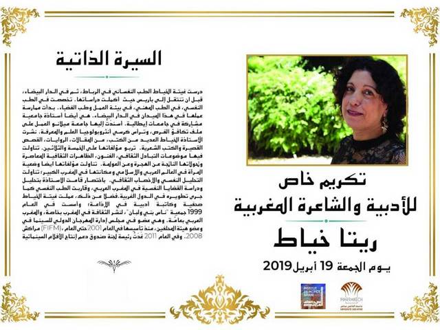 في إطار التعاون بين قسم الفلسفة بكلية الآداب والعلوم الإنسانية بمراكش التابعة لجامعة القاضي عياض وكرسي معهد العالم العربي التابع لمعهد العالم العربي، حضيت السيدة غيثة الخياط، الكاتبة الصحافية،الأديبة والطبيبة النفسية والشاعرة والناشطة الحقوقية المغربية، بتكريم خاص خلال فعاليات تظاهرة علمية نظمت يوم الجمعة 19 ابريل 2019، برحاب المدرج 3 بكلية العلوم والتقنيات بمراكش.