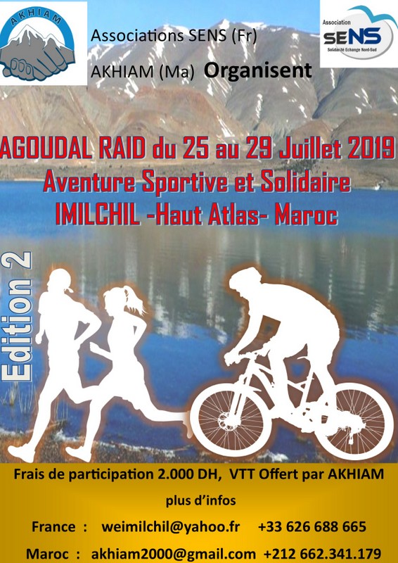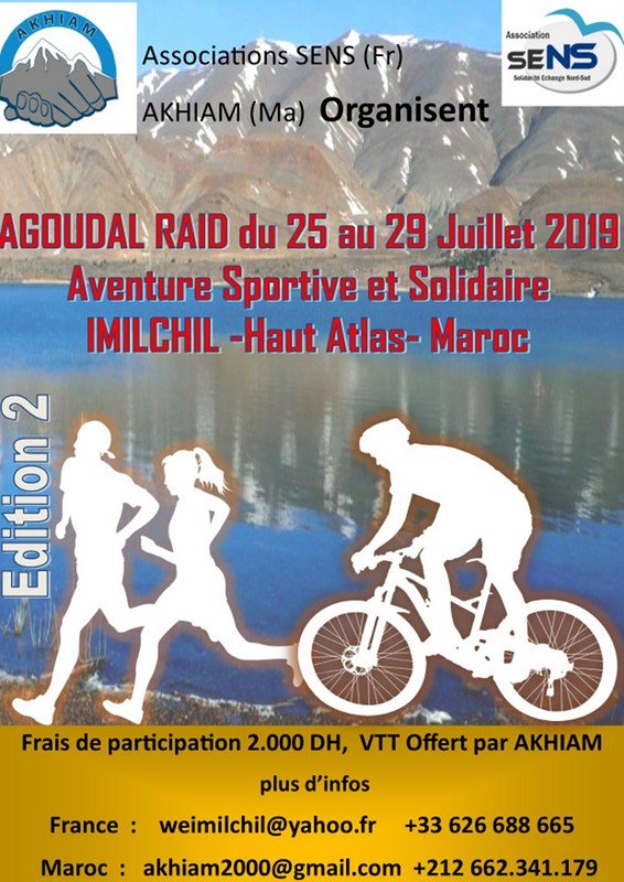 L’association Akhiam pour le Développement économique et social en partenariat en partenariat avec l’association Solidarité Echange Nord Sud (SENS) de Bordeaux (France) organise la Deuxième édition du raid sportif : « Agoudal Raid » du 25 au 29 juillet 2019 prochain au village d’Agoudal relevant de la collectivité territoriale d’Imilchil dans la province de Midelt.